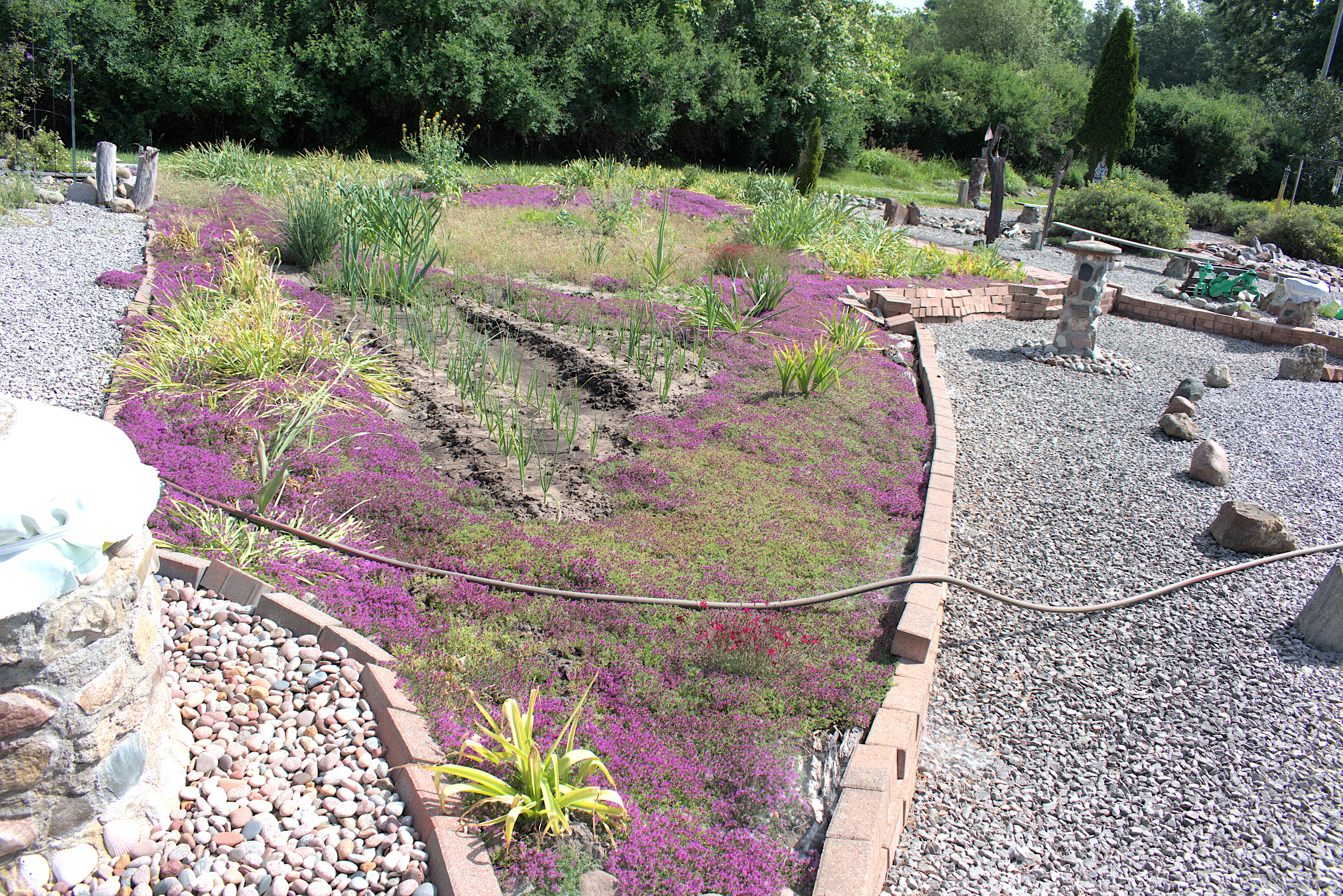 Midsummer 2020, the creeping thyme blooming, with the bunching onions behind it. The creeping thyme has finally filled in this edge.